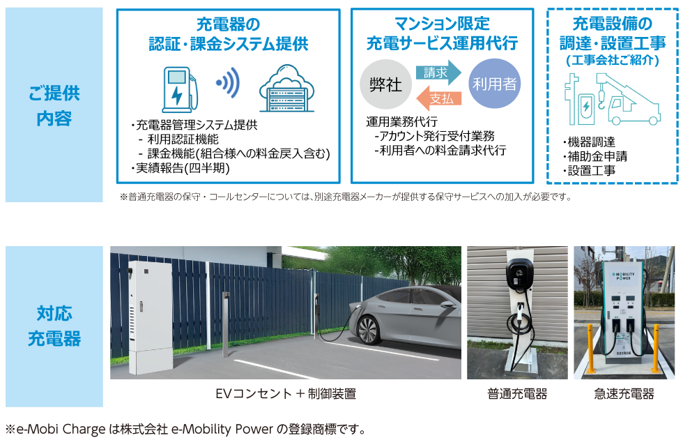 - 本ソリューション「e-Mobi Charge」導入物件の居住者さまは、e-Mobility Power会員サービス(A15)もご契約いただくと、1つのアカウントでマンションと外出先両方のEV充電器をご利用いただくことが可能です。