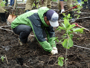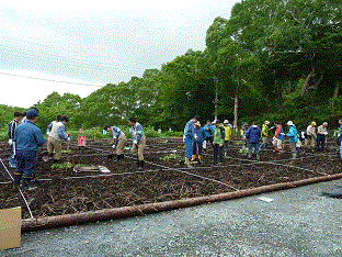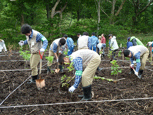 平成28年6月17日、鳩待峠入山口において、当社は、尾瀬関係者や地元の群馬県立尾瀬高校の生徒など約40人とともに、ブナやミズナラ、ナナカマドなど約100本の苗木を植えました。